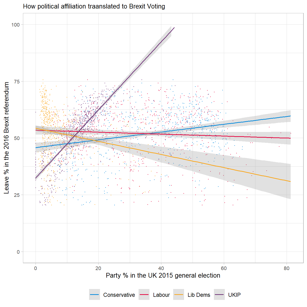 Using my data manipulation and visualisation skills, I used the Brexit results dataframe and conducted an analysis of how political affiliation translated into the Brexit voting.